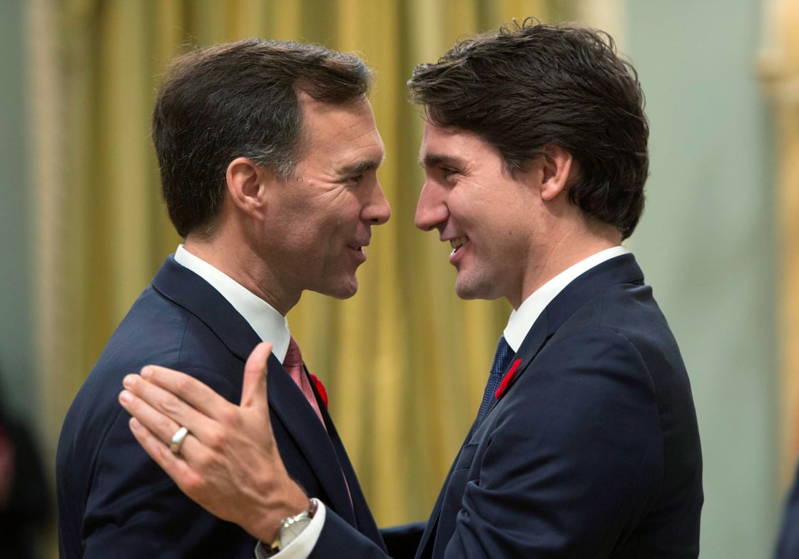 Morneau (left) at his swearing-in with then-prime minister Justin Trudeau on Nov. 4, 2015, at Rideau Hall in Ottawa. THE CANADIAN PRESS/Sean Kilpatrick